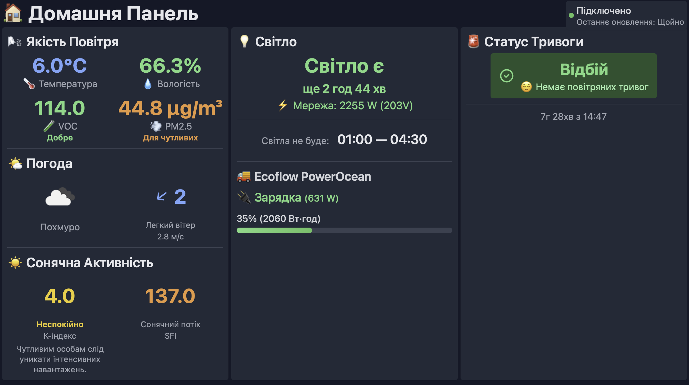 За вихідні (насправді, ранок неділі) навайбкодив собі домашню панель, як і збирався цього тижня. “Навайбкодив” в цьому разі значить — не писав код самостійно. Та навіть майже не перевіряв його. Чесно, на більше немає часу, а панель потрібна — зокрема, щоб розуміти, чи електрика йде з мережі або з резерву.